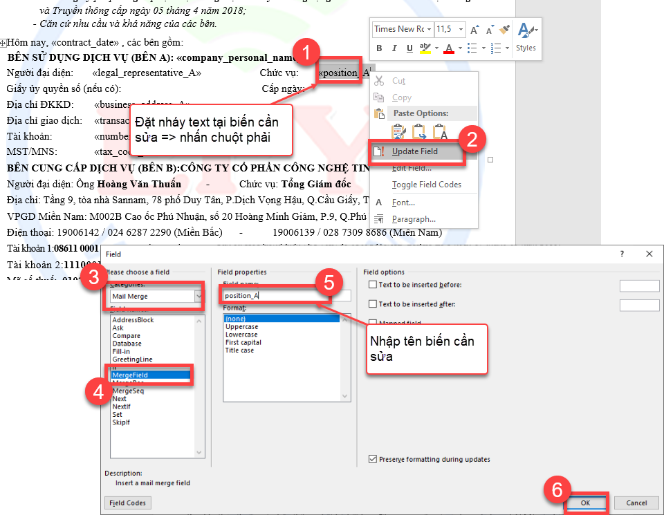 - Trên file mẫu, nội dung nào biến động thay đổi theo từng lần lập hợp đồng (Ví dụ: Thông tin bên nhận hợp đồng) thì anh chị đặt biến cho thông tin đó theo hướng dẫn dưới đây (Biến viết liền không có dấu và khoảng trắng).